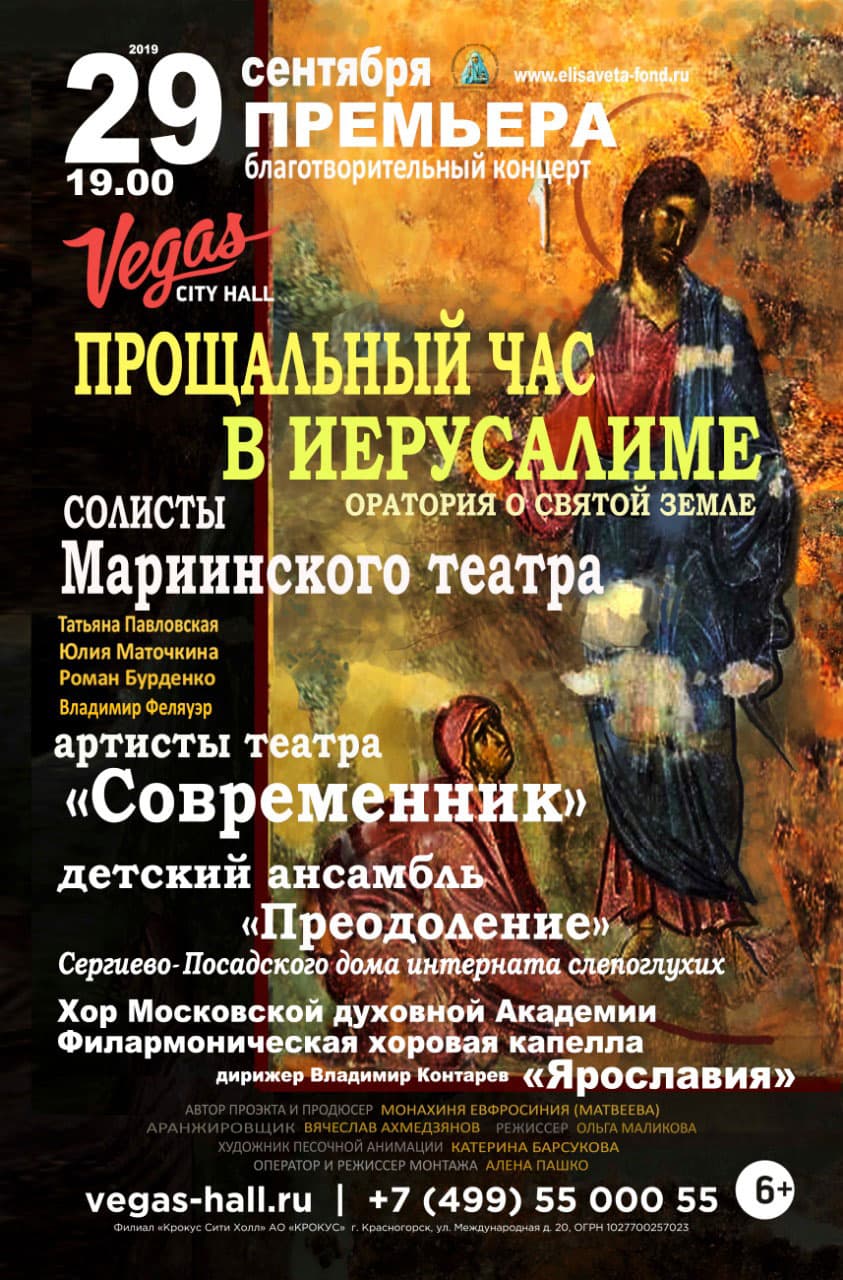Именно таким проектом является оратория о Святой Земле «Прощальный час в Иерусалиме». Рождение проекта благословлено Святейшим Патриархом Московским и всея Руси Кириллом. В содержании её – дореволюционные песнопения – канты в современной обработке для солистов, хора и оркестра. В них отражаются Евангельские события, произошедшие на Святой Земле более двух тысячелетий назад; события, которые являются самыми важными в Православии: Жизнь и Жертва за будущее на Земле Сына Божьего – Иисуса Христа.